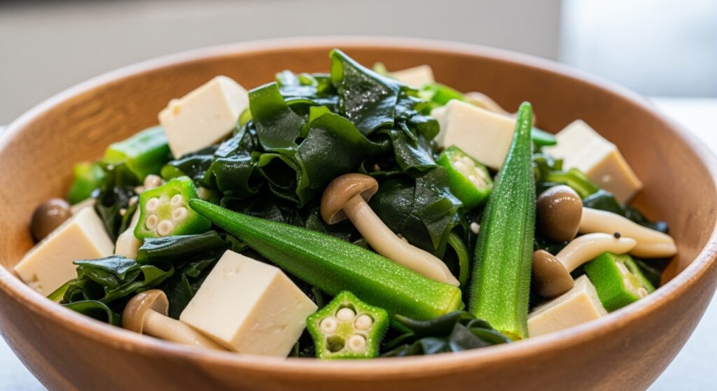 わかめ、豆腐、オクラ、なめこ、お好みのドレッシング - 作り方
