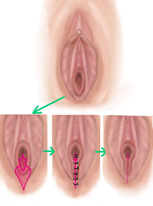 膣縮小術は、ゆるんでしまった膣壁を切開して縫い縮めることにより、物理的に膣の内部を狭める方法です。
